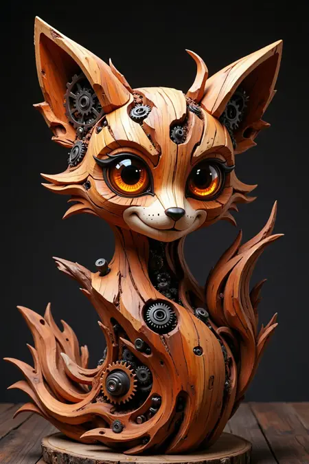나무 질감과 기계 요소의 결합, 교활한 여우를 형상화하세요. 불타는 털은 나무로, 꼬리와 귀에는 기어가, 교활한 기계식 눈을 지니고, 황혼 같은 분위기를 연출하세요.