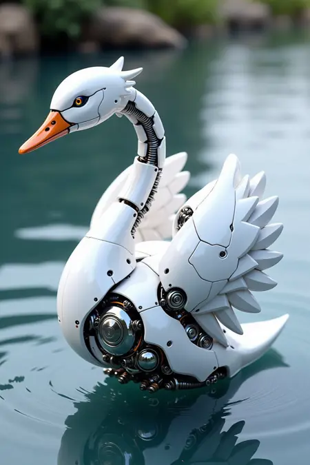기계 동물 디자인, 우아한 기계 백조, 흰 세라믹 같은 금속, 회전하는 프로펠러 날개, 미래적인 호수.