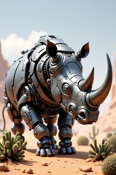 기계 동물 디자인, 단단한 기계 코뿔소, 두꺼운 강철 갑옷, 제트 추진 뿔, 금속 선인장이 있는 사막.