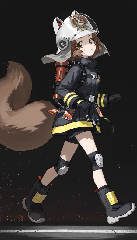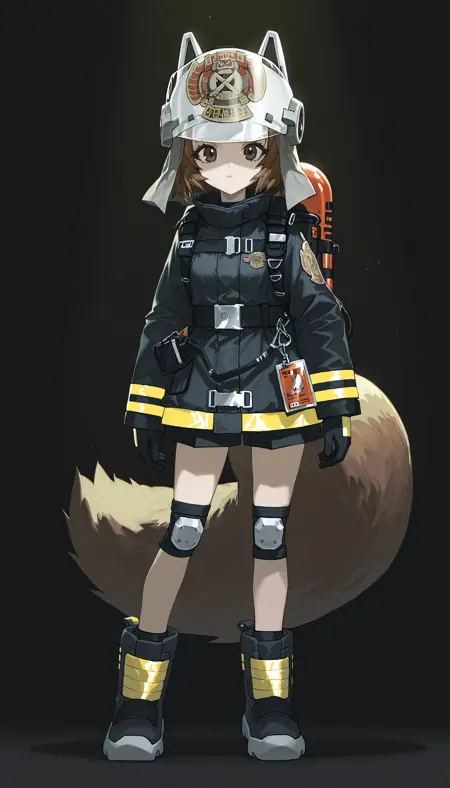 茶色の目、茶色の髪、ショートヘア、リスの尾、動物の耳、ヘルメット、