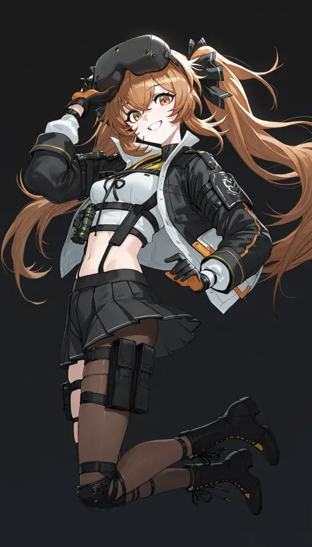 露脐,白色衬衫,黑色夹克,敞开式夹克,超短裙,单膝护甲,黑色手套,黄色臂章,背带,爆炸物,