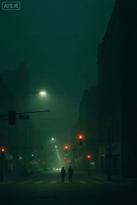 2、kbmh_v1.0, 夜の霧のかかった都市の通り。手前に薄く灯された横断歩道があり、遠くにぼんやりと二つの影の人物が立っている。街灯と交通信号が faint に灯り、シーン全体に憂鬱な緑がかった青い色調を放っている。右側の建物は暗く、ほとんど見えず、不気味な雰囲気を強調している。