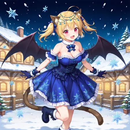 Il-hdmlily,lily-christmas,blonde hair,twintails,cat ears, cat tail,hair ribbon,red eyes,bat wings,hair chain,winter dress,wool,wool choker,neck ribbon,blue dress,dress frills,arm frills,winter sleeves,winter boots,
