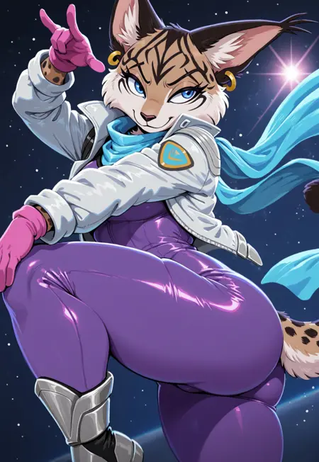 1girl, furry lynx, light blue eye, light brown fur with black patterns, Miyu from Starfox 2, purple jumpsuit, light blue scarf, hot pink gloves. jacke