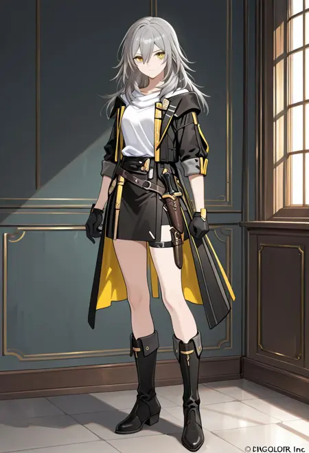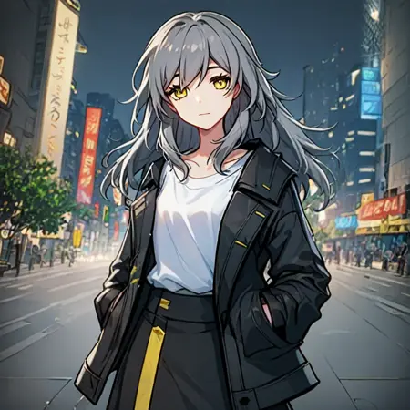 `grey_hair, yellow_eyes, yellow jacket, black skirt, thigh_strap`