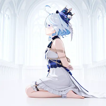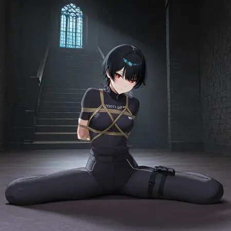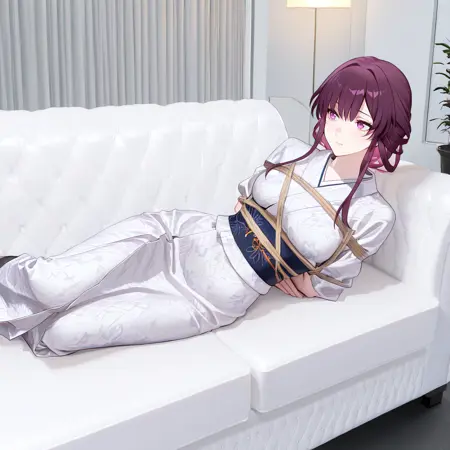 TasukiTie, bound, 1girl, sitting on sofa, on side