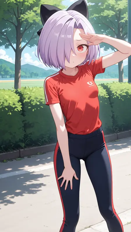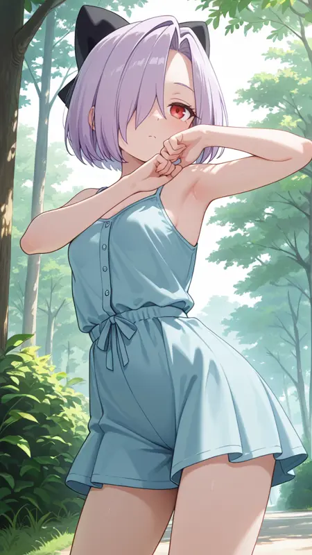 Ciel, red eyes, short hair, lilac hair, hair over one eye, hair intakes, sidelocks, bob cut, big black hair ribbon, small breasts,