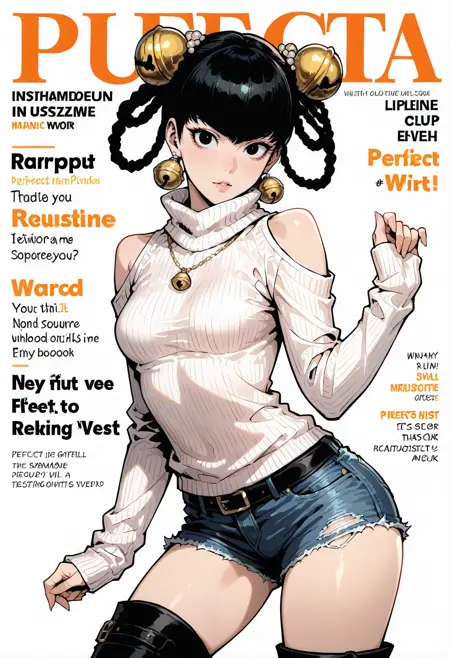 대체 복장: 어깨 노출, 귀걸이, 목걸이, 보석, 가슴, 작은 가슴, 스웨터, 터틀넥, 터틀넥 스웨터, 주름진 스웨터, 흰 스웨터, 컷아웃 복장, 어깨 컷아웃, 손목을 넘는 긴 소매, 벨트, 반바지, 청바지 반바지, 짧은 반바지, 허벅지 길이 양말, 무릎 위 양말, 부츠, 검은 신발