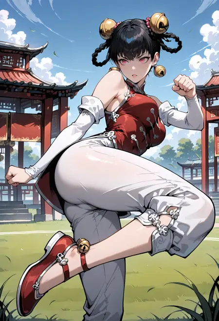 복장: 보석, 팔찌, 팔찌, 가슴, 중간 크기 가슴, 어깨 노출, 스카프, 흰 스카프, 셔츠, 빨간 셔츠, 중국 복장, 중국 드레스, 흰 소매, 어깨 없음, 분리된 소매, 바지, 흰 바지, 카프리 바지, 넓은 바지, 평지 신발, 빨간 신발