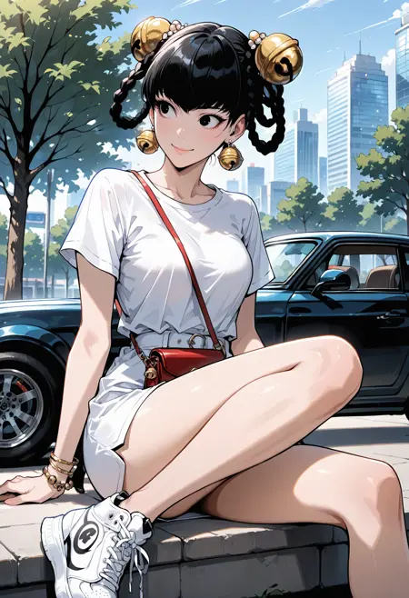 외모: 1명의 소녀, 검은 눈, 검은 머리, 두 줄기 꼬리, 짧은 머리, 꼬리, 앞머리, 머리 고리, 종, 머리에 달린 종, 작은 종, 머리 장식