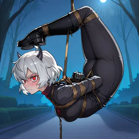 CircleTie,1girl, 결박됨, 로프, 허리가 곧게 곧은 자세, 매달림, 옆에서