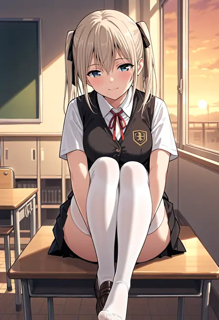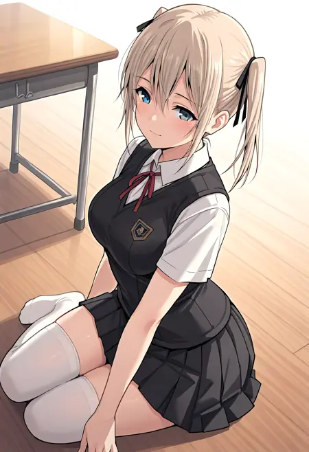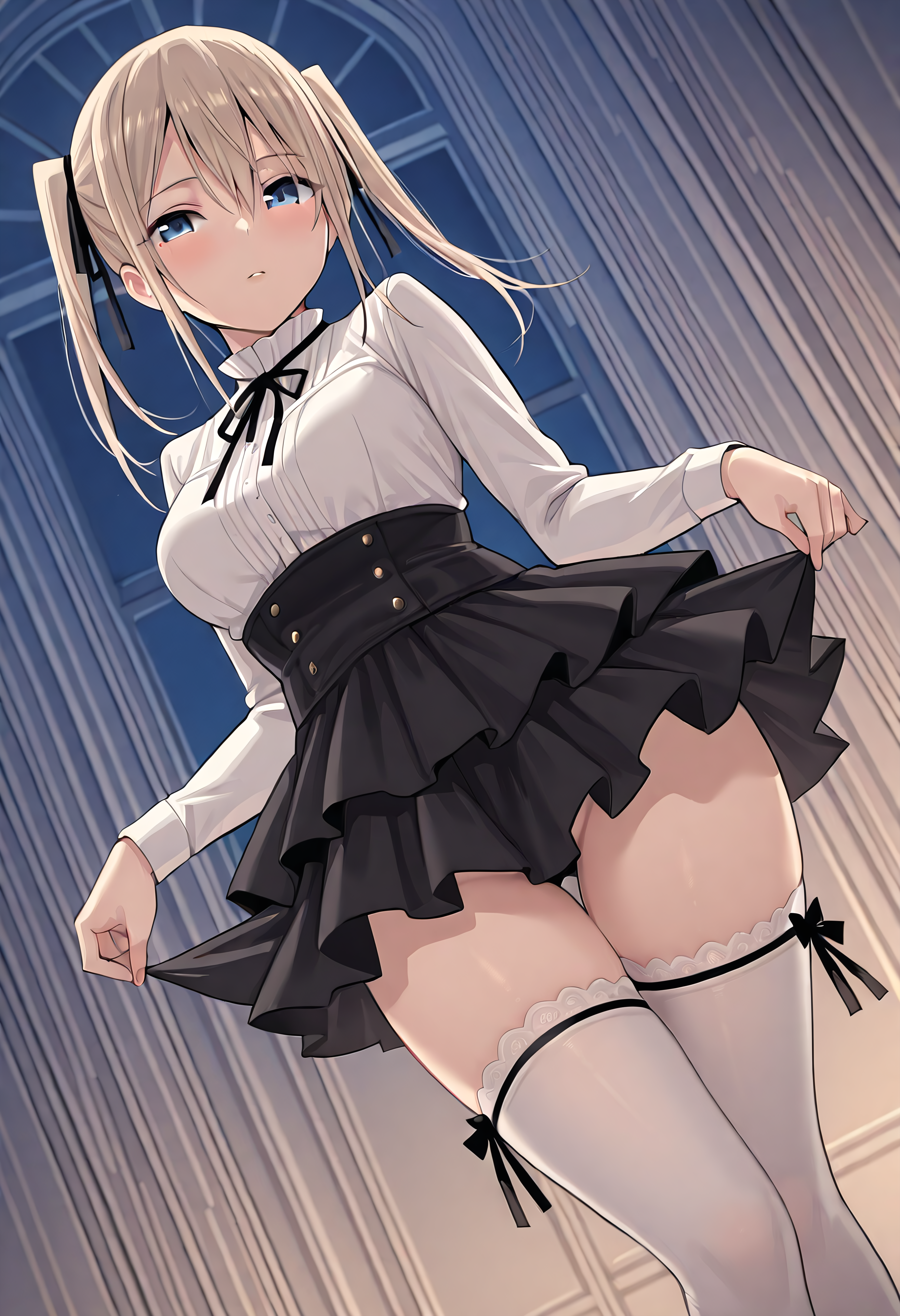 プロンプト: YudateDoris, 1girl, 淡い灰金色の髪, ツインテール, 青い目, 黒い髪リボン