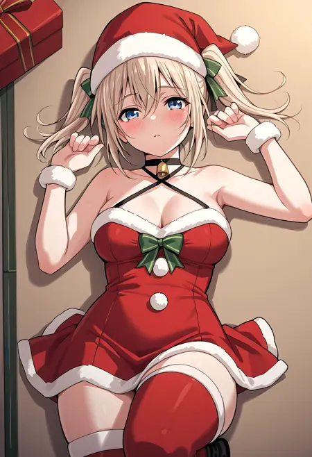 衣装4(クリスマス): ファー縁取りのサンタ帽、肩を露出、ファー縁取り、白いファー縁取りの赤いクリスマスドレス、細い赤い紐でクロスハルター、ファー縁取りの赤いシンクホイールブーツ、首輪にベル、ドレス中央に緑のリボンとベル、短いドレス、白いファーのブレスレット、白いファーのリストカフ