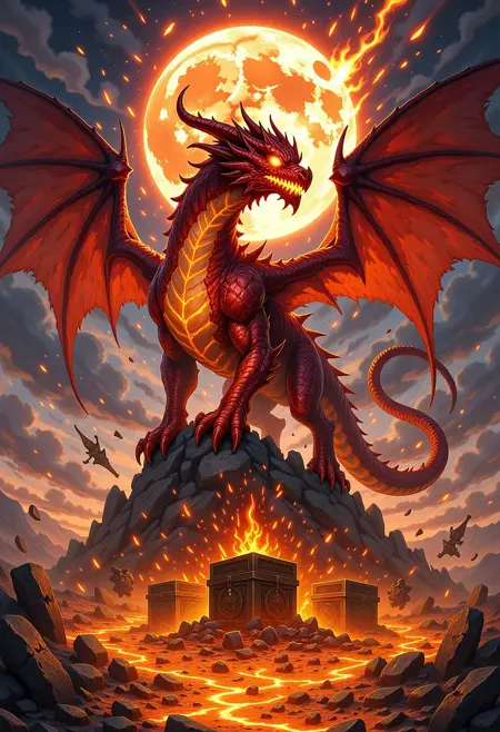 魔法が衰え、滅びつつある世界の光景を作成してください。空にはドラゴンが旋回し、血の破片のような月が崩壊の直前です。