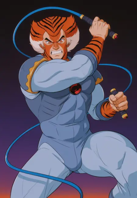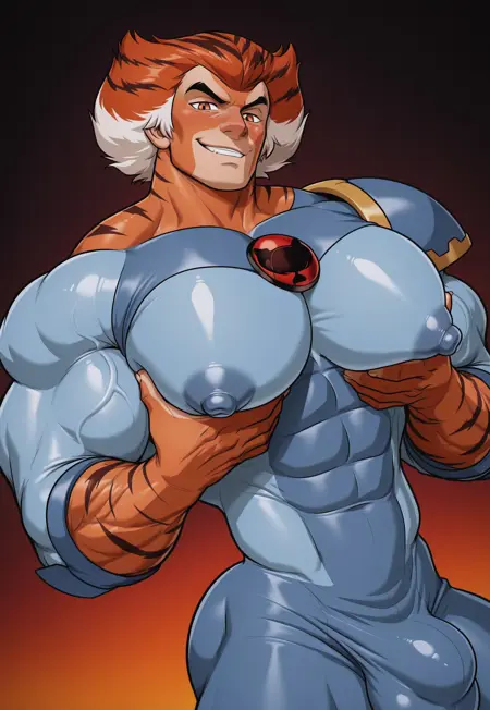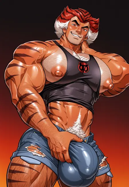 tygr4, two-tone orange skin, tiger stripes, orange and white two-tone hair, tiger pattern hair, white sideburns, spiked hair, orange eyes