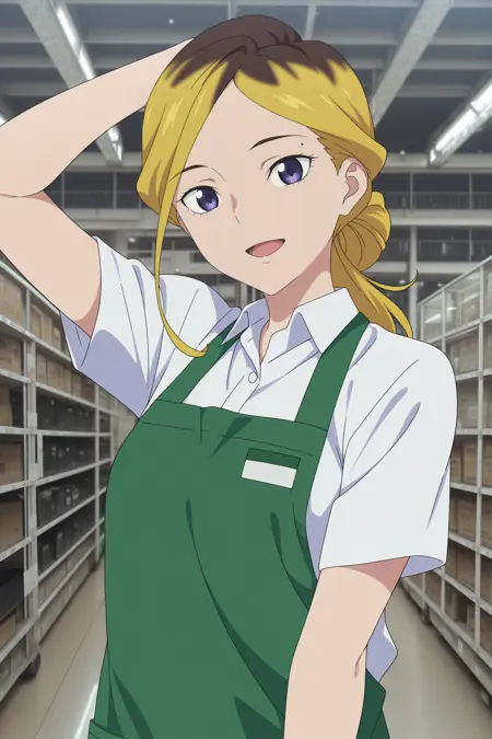 inamoto, long hair, blonde hair, wavy hair, ponytail, single hair bun, parted bangs, single sidelock, purple eyes, mole above eye, short sleeves, white shirt, collared shirt, green apron, blue pants, sneakers