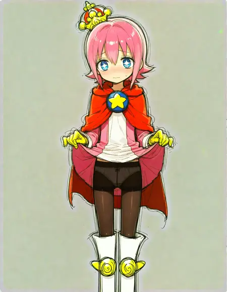 cape, star (symbol), gloves, mini crown, boots, pantyhose, red cape, yellow gloves,