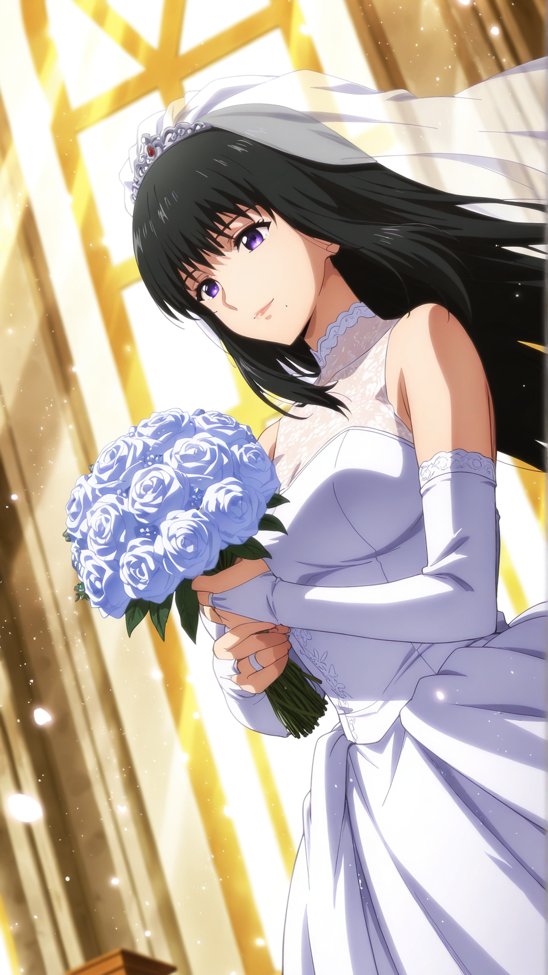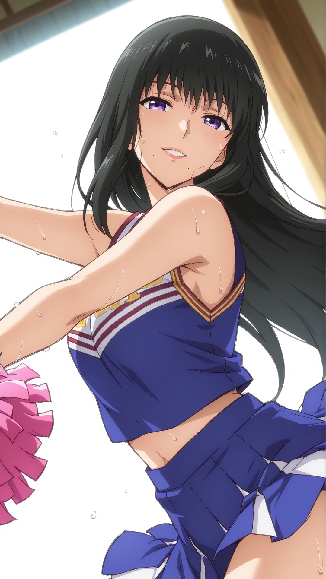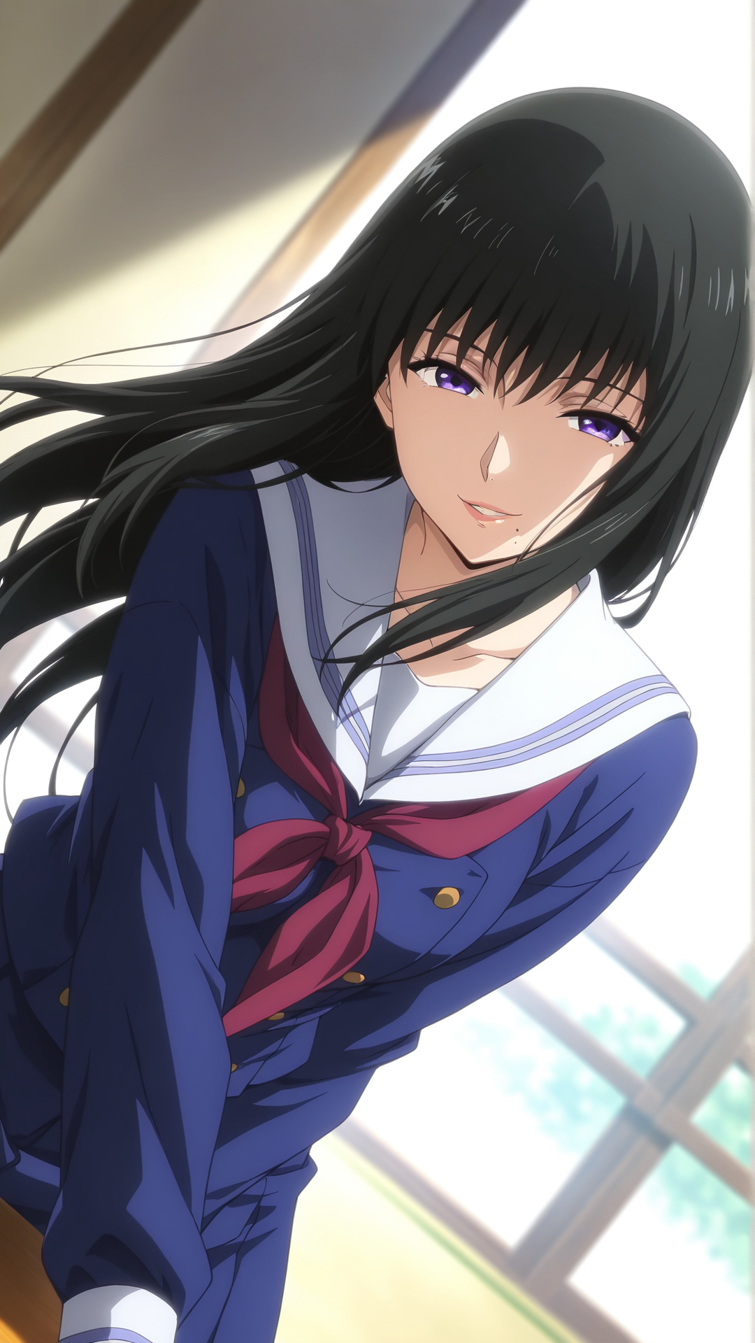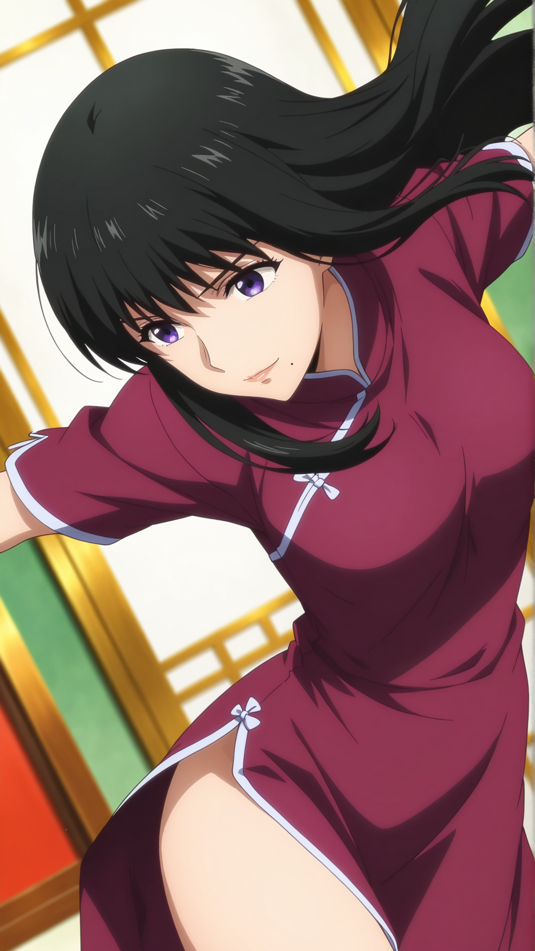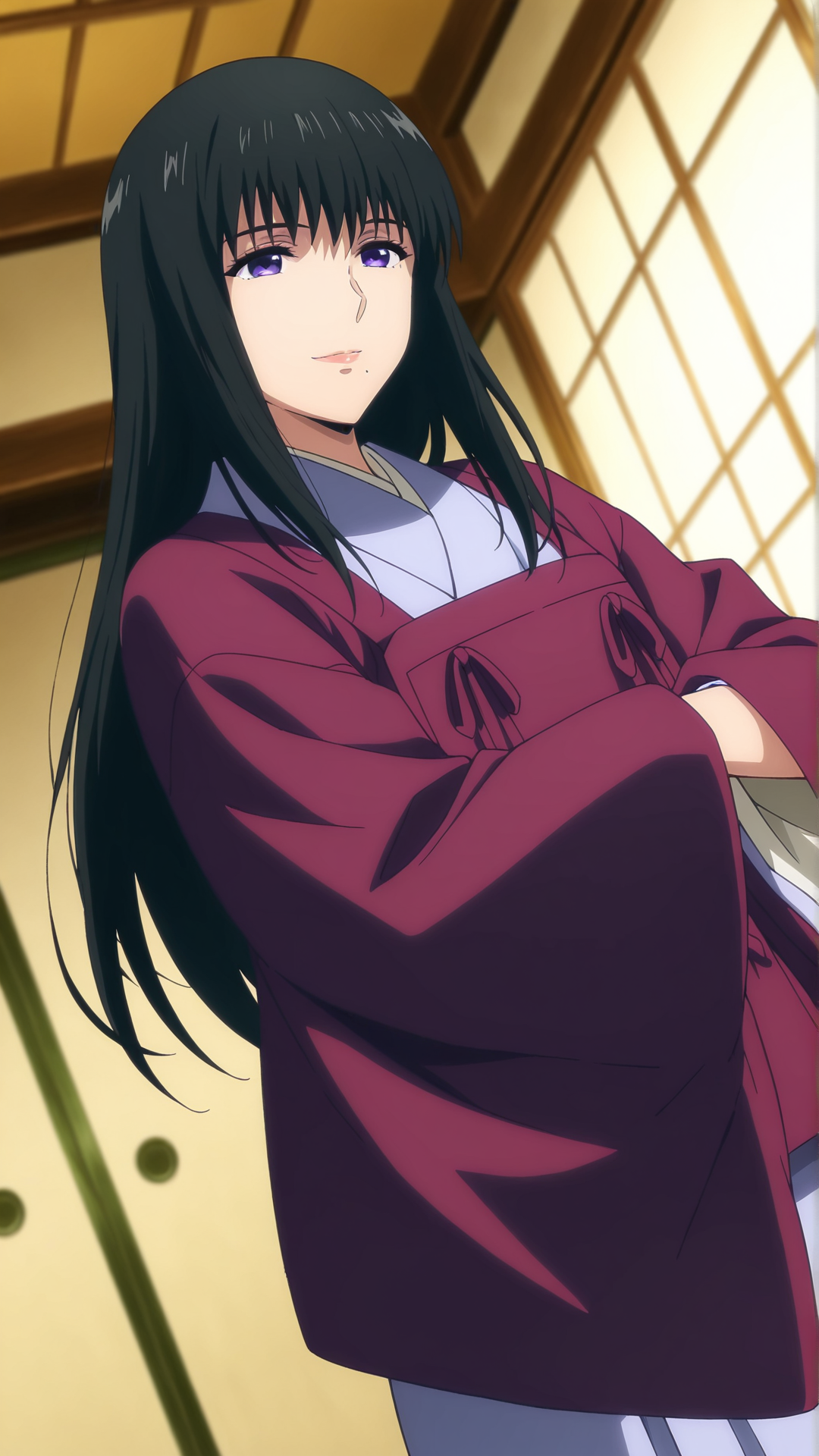 外見: 黒髪、長髪、紫の目、口の下にほくろ、