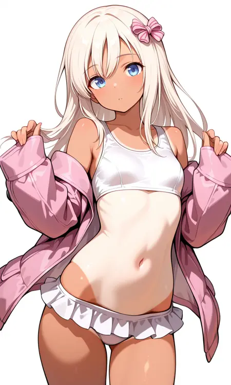 여름 복장: RO500summerKC, 긴 머리, 긴 소매, 분홍색 리본, 머리 리본, 비키니, 열린 옷, 열린 재킷, 흰색 비키니, 햇빛에 탄 피부, 프릴이 있는 비키니, 탄 자국, 분홍색 재킷, 비키니 스커트, 원피스 햇빛에 탄 피부, 머리 장식,