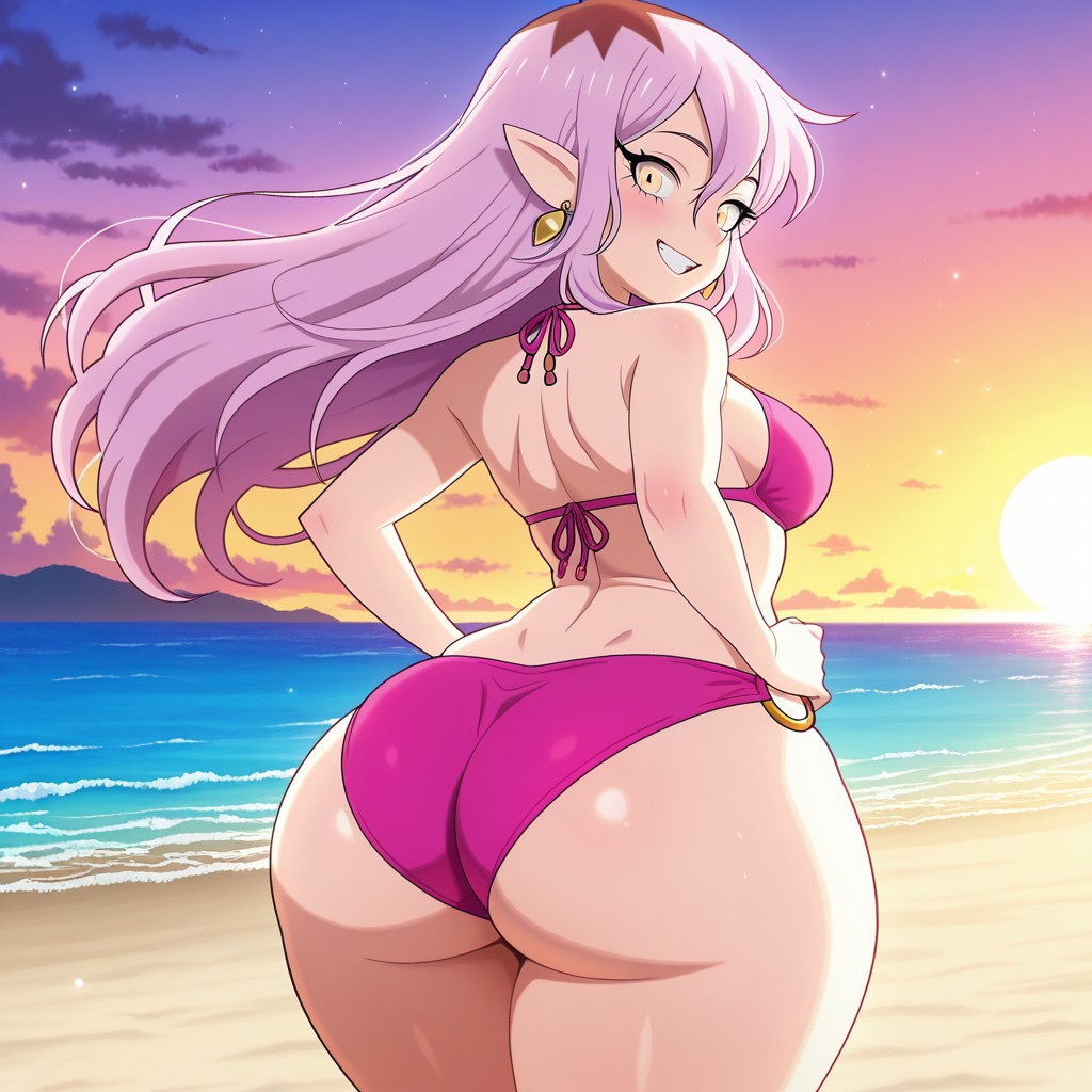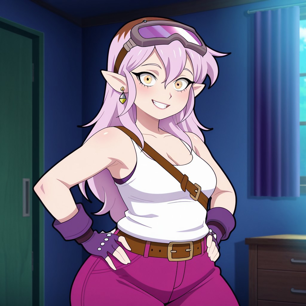 성인 애미티 블라잇, 날카로운 귀, 보라색 머리, 다채로운 머리카락, 긴 머리, 노랑색 눈, 가슴선, 귀걸이, 금색 귀걸이, 원형 귀걸이, 티셔츠, 흰색 티셔츠, 바지, 분홍색 바지, 벨트, 갈색 벨트, 안경, 머리에 안경, 보라색 안경, 파란 렌즈, 장갑, 손가락이 없는 장갑, 보라색 손가락이 없는 장갑, 끈, 갈색 끈, 어깨에 끈, 날씬한 허리, 큰 엉덩이, 넓은 엉덩이, 큰 허벅지, 두꺼운 허벅지, 통통한
