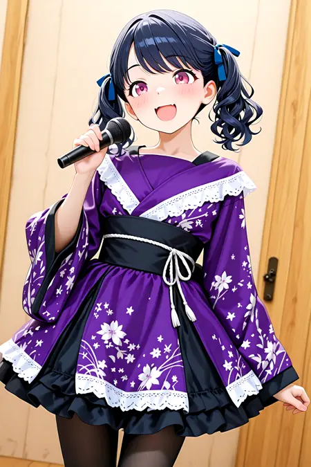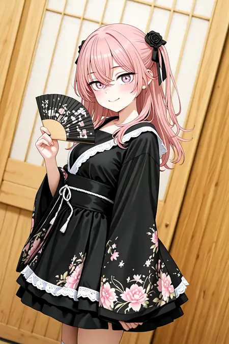 Kimono_Style_Dress, cosplay, dress, japanese clothes, wide sleeves, short kimono, floral print, ribbon, long sleeves, hair ribbon, sash, obi