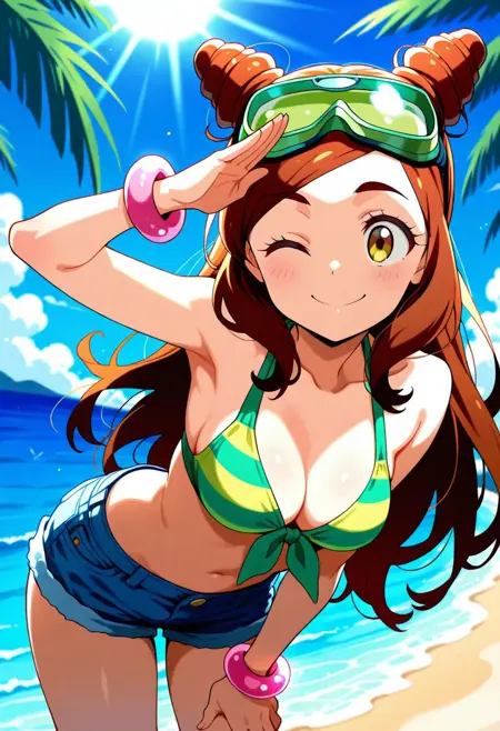 绿黄条纹泳装,前系式比基尼上装,肚脐,胸部,牛仔短裤,蓝色短裤,蓬松手环,粉色手环,绿色潜水镜,眼镜戴在头上,凉鞋