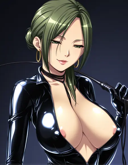 haruno bld, green hair, medium hair, hair over shoulder, single hair bun, green eyes, lips, choker, hoop earrings, white shirt, cleavage, bra peek, black bra, lace-trimmed bra, red skirt, pencil skirt