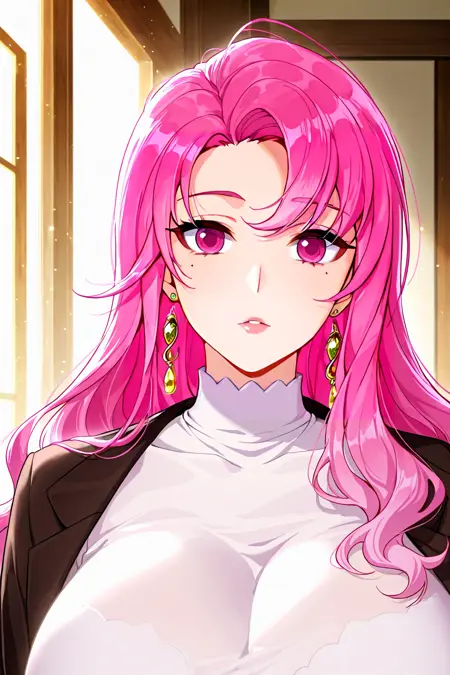 nan shuishui, long hair, pink hair, pink eyes, mole under eye, asymmetrical hair, earrings, jewelry
