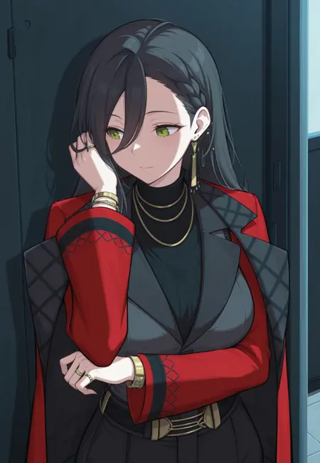 搭在肩膀上的夹克, 毛衣, 背心, 饰品, 皮带, 黑色长裤, 项链, 戒指, 手镯, 黑色鞋子,