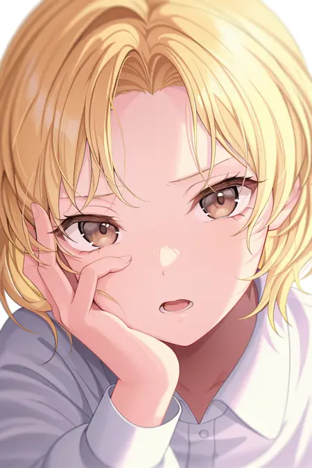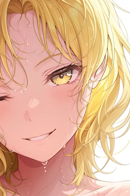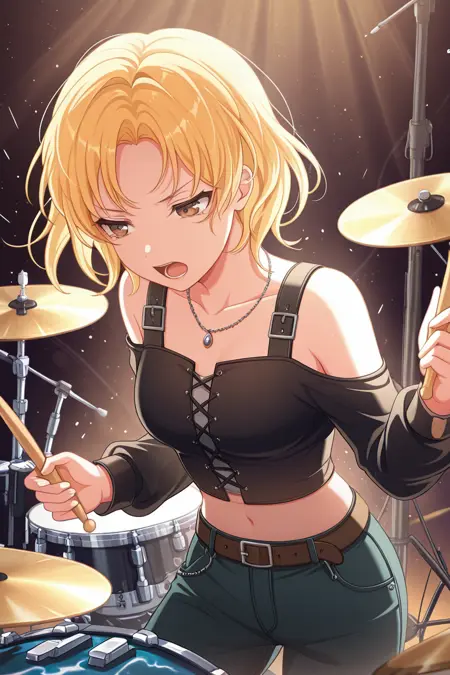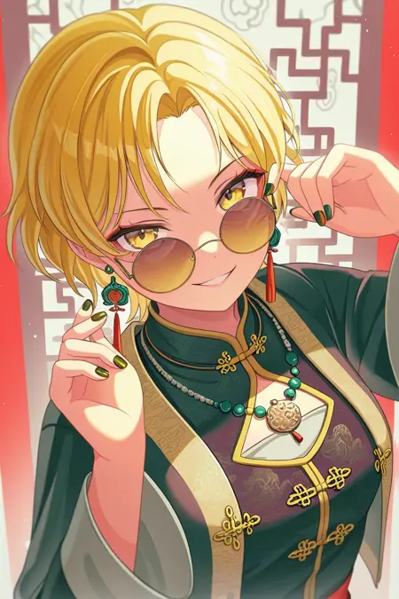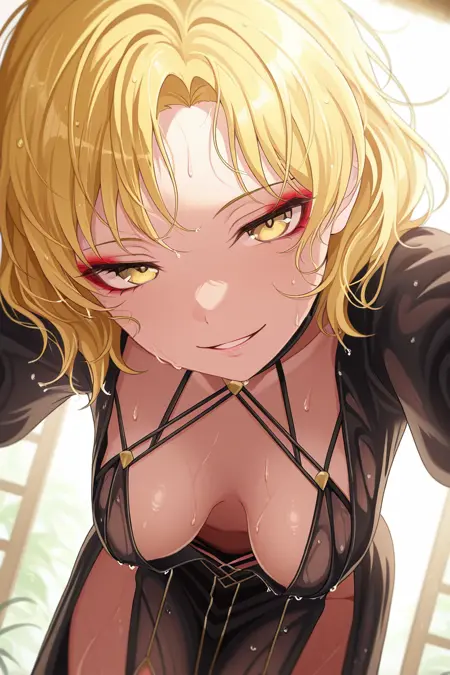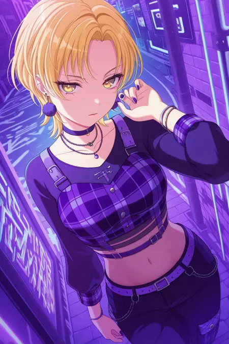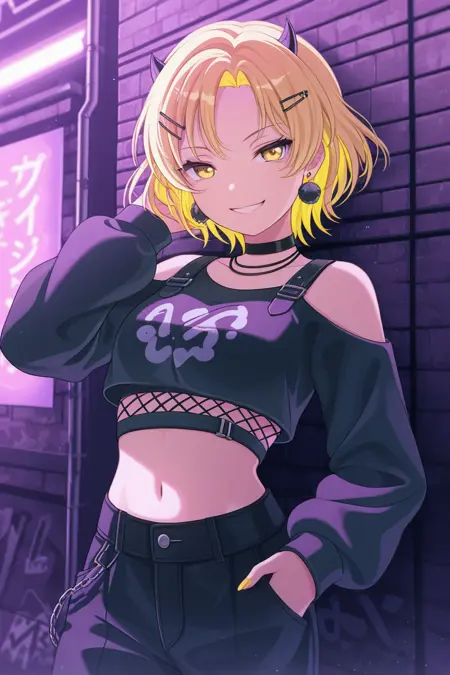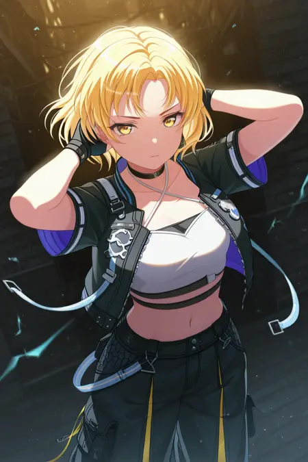 satoumasuki, 1girl, solo, blonde hair, short hair, gloves, fingerless gloves, black gloves, looking at viewer, short sleeves, open clothes, criss-cross halter, jacket, black jacket, yellow eyes, open jacket, midriff, navel, choker, wide pants, white top, jewelry, onstgsk