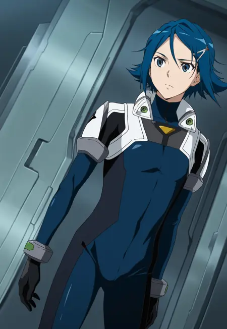 1소년, 남성 중심, 혼자, 파란 눈, 파란 머리, 헤어클립, 조종복, 흰색과 파란색 조종복, 장갑,