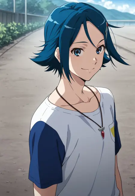 1소년, 남성 중심, 혼자, 파란 눈, 파란 머리, 헤어클립, 귀걸이, 목걸이, 티셔츠, 다색 티셔츠, 흰색과 파란색 티셔츠, 짧은 소매, 팔찌, 초록색 바지, 카프리 바지, 스니커즈,