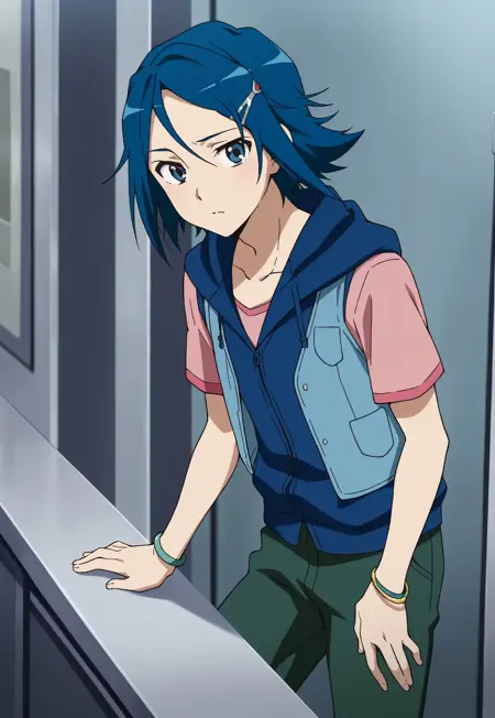 1소년, 남성 중심, 혼자, 파란 눈, 파란 머리, 헤어클립, 귀걸이, 분홍색 셔츠, 짧은 소매, 파란 후디, 후드, 소매 없는 후디, 파란 조끼, 팔찌, 초록색 바지,