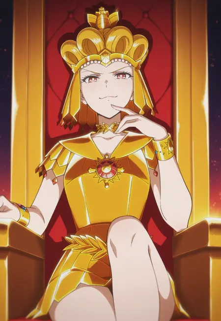 crown, choker, jewelry, golden armor, bracelets, golden boots,
