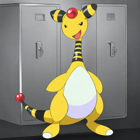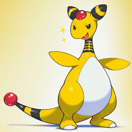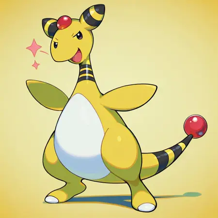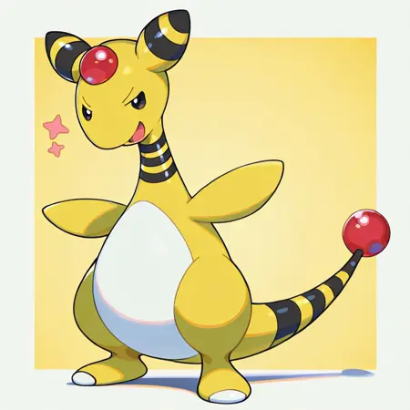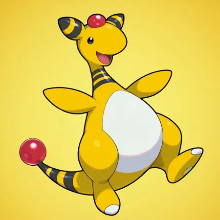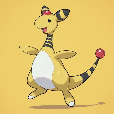 ampharos, pokemon (creature), yellow fur, white belly, black eyes, red orb on forehead, red orb on tail, two black rings on ears, three black rings on neck, three black rings on tail, no fingers, one white toe on each foot
