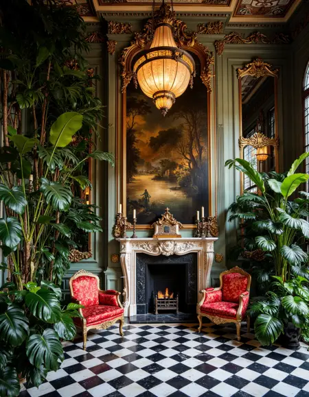 細工された鉄製の装飾と石細工が施された、荘厳な建物の入り口。温かい金色の照明が背の高いアーチ型の窓を照らし、優雅なグレーの石造りの外壁と調和している。周囲には繊細な曲線の装飾と、地面に散らばる葉が描かれた写真。thierry-lechanteur のスタイルで
