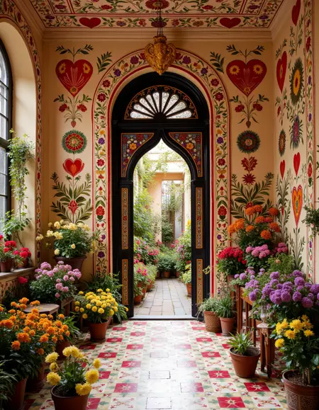 緑の窓とドアの周りに赤、ピンク、青、黄の色合いで広がる大きな花々の鮮やかなフレスコ画で飾られた、質素な家。柔らかいベージュの外壁に囲まれ、明るい青空の下、石畳のテラスに贅沢な鉢植えの植物が並んでいる写真。thierry-lechanteur のスタイルで