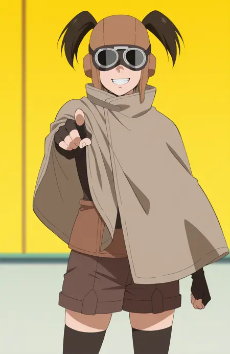 - 飞行员帽,飞行员护目镜,棕色头饰,头盔,护目镜,短裤,露趾腿饰,黑色过膝袜,靴子,无指手套,肘部手套,斗篷,