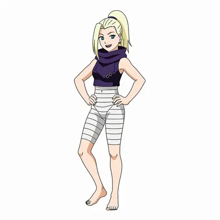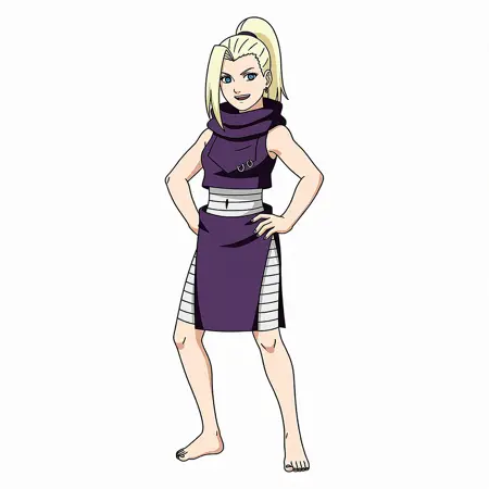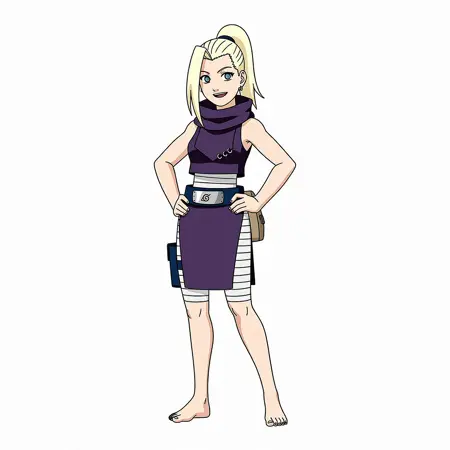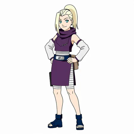 ino yamanaka, ponytail, long hair (or) shoulder length hair, purple high-collared blouse, white arm warmers, purple skirt, thigh holster, bandages, bandaged leg, belt, forehead protector, konohagakure symbol, earrings, anime screencap(使用しているチェックポイントがそのような画像を生成できる場合、オリジナルのアニメに近い画像を出力するため;)