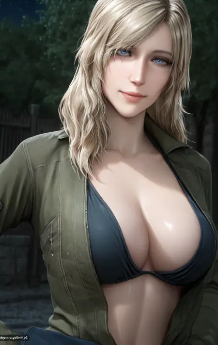 1girl, solo, long hair, looking at viewer, blue eyes, blonde hair, jacket, open clothes, no bra, green jacket,night, realistic,ev4m3t4l