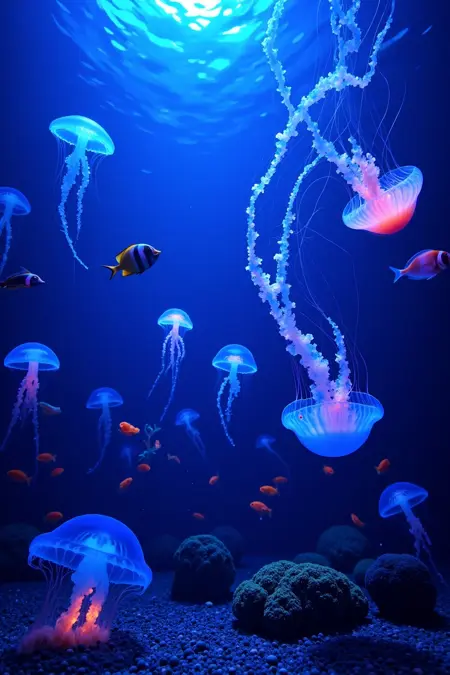 해파리와 물고기가 있는 수중 장면, 네온색 생물, 생물 발광 효과, 어두운 파란 배경 속 심해의 신비로움.