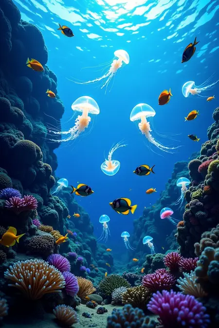 해파리와 물고기가 있는 수중 장면, 화려한 산호초, 맑은 푸른 물을 통해 스며드는 햇빛, 평온한 해양 낙원을 표현하세요.
