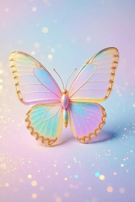 多彩的粉彩色调与闪烁效果,一只蝴蝶拥有渐变粉彩翅膀,细小闪烁,梦幻背景。
