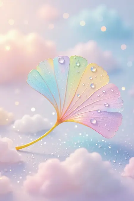 多彩的粉彩色调与闪烁效果,一片单叶银杏,色彩渐变,水滴晶莹,柔和云层背景。