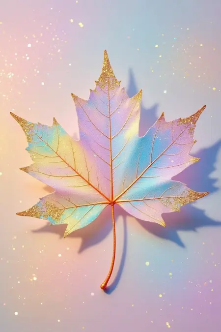 多彩的粉彩色调与闪烁效果,一片枫叶呈现虹彩色彩,周围金色闪烁,光线柔和。