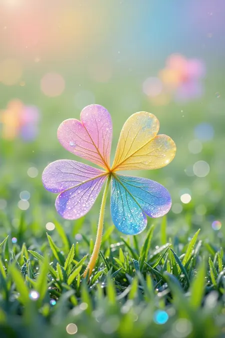 多彩的粉彩色调与闪烁效果,四叶草带着彩虹色花瓣,草地上闪烁着微光,柔焦效果。