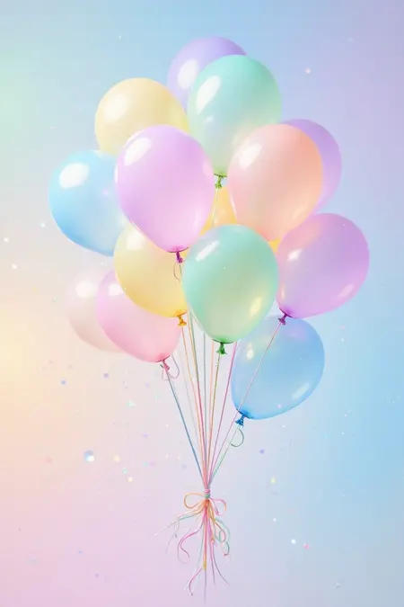 多彩的粉彩色调与闪烁效果,一簇粉彩气球,拖曳着闪烁的尘埃,晴空万里。