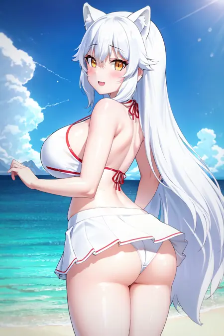- swimsuit, white bikini,(midriff:1.2), white skirt,(bikini skirt:1.3), red_bow,navel, outdoors, cleavage, sarong, bare shoulders, sandals,sidelocks,dated