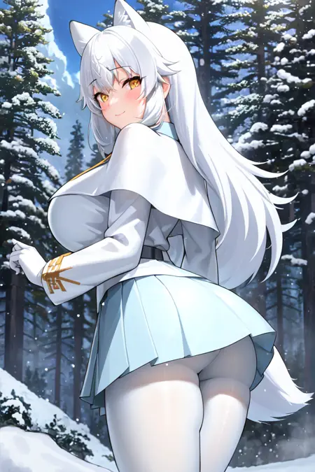 school uniform,white shirt,(blue skirt:1.2), (white pantyhose:1.4),(capelet:1.3), long sleeves,fur trim, pleated skirt,blue_bow, (white gloves:1.2), (miniskirt:1.4), (white footwear)