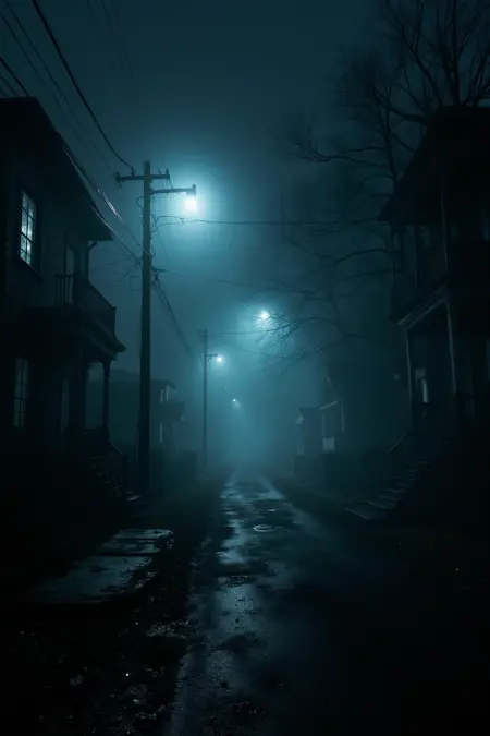 어두우며 기괴한 분위기, 자정의 외로운 거리, 안개가 흐르고, 가로등이 깜빡이며, 모든 모서리에 보이지 않는 공포가 숨어 있다.